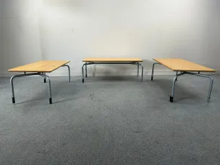 Ein Set aus 3x DAN Classics Couchtischen mit Holzplatte und Metallsockel, einige Abnutzungsspuren.